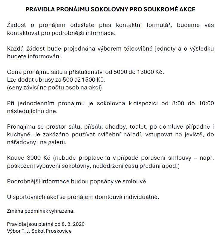 Nabízíme možnost pronájmů prostor naší sokolovny pro soukromé účely, ať už ke sportovním aktivitám, oslavám nebo plesům.